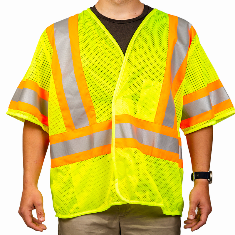The certified ANSI/ISEA 107-2015 Class 3 Mesh Single-Size Safety Vest. Constructed with breathable 3.0 ounce, 100% polyester fluorescent mesh. Tape is placed vertically from front to back over each shoulder, one continuous stripe horizontally around vest (Size small has additional horizontal stripe between vertical stripes in back) and one stripe horizontally around sleeves. The Caltrans vest includes a Caltrans reflective logo on the upper left front of the vest.