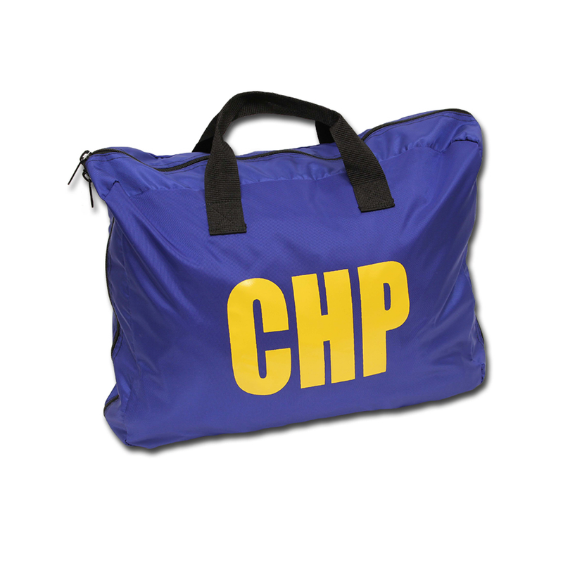 The CHP Rainwear bag in blue nylon is silkscreened with CHP logo on both sides.