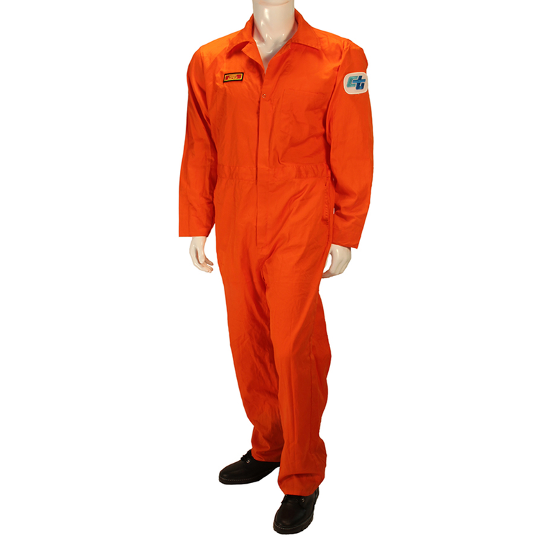 The Long Sleeve Orange Coverall has a two-way concealed nylon zipper and heavy duty double action snaps. Features a breast pocket with pencil slot, tool pocket on right side and two large hip patch pockets. Two side slash pockets with finished opening for access to under clothing. Garment stress points are bar-tacked and there is a snap closure at the two-ply neck and both of the two-ply sleeve cuffs. Shirred elastic waistband inserts with pleated action back.
