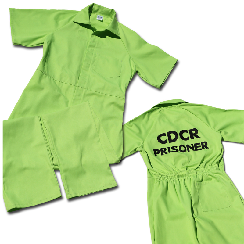 The Luminous Green Jumpsuit features one right hip pocket and one left breast pocket. Silk-screened on back in black ink "CDCR Prisoner."