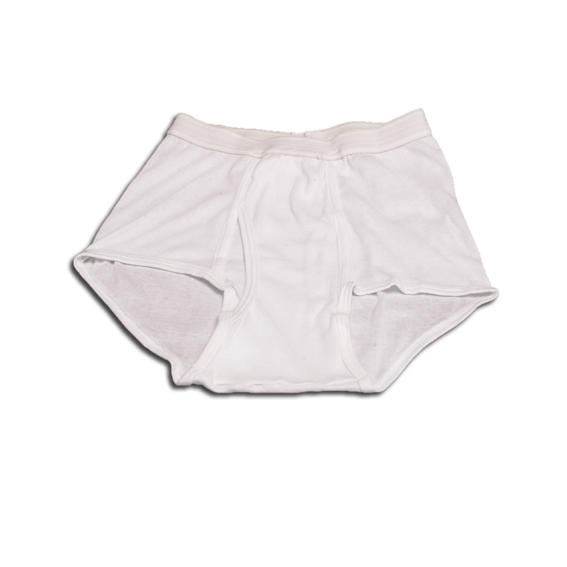 The Men's Knit Brief have an elastic waist. No-gap fly front. Taped seams. Leg openings finished with knit bias and one piece back.