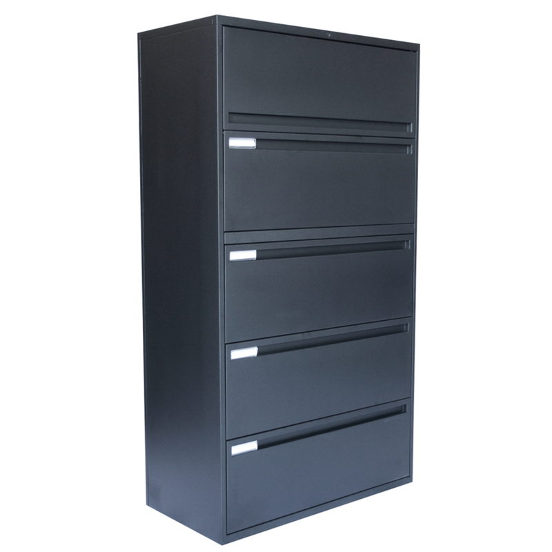 The Lateral File Bin is metal, freestanding, has four locking drawers below, and top shelf with lift-up flipper door, counterweight included. Top shelf will not accommodate binders. Drawers notched to accept drawer dividers. Accommodates letter/legal files. Non-tip feature: only one drawer will open at a time. Included are 2 lengthwise file bars per drawer for side access. Item #5640 bars are needed for front-to-back access.