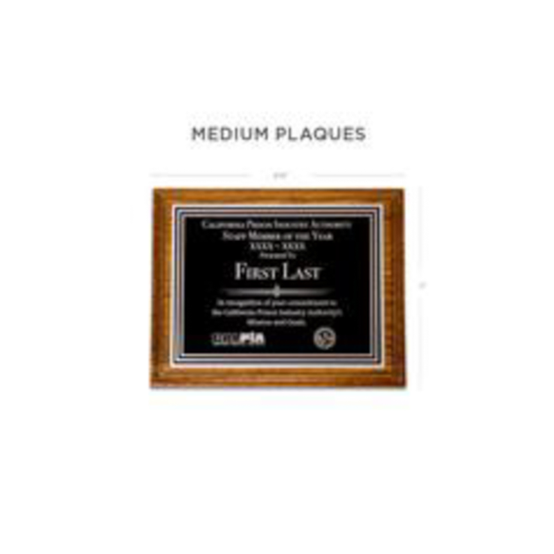 Our medium standard plaque offering has an overall size of 7" H x 8 3/4" W. Actual engraving plate is 5 3/8" H x 7" W.