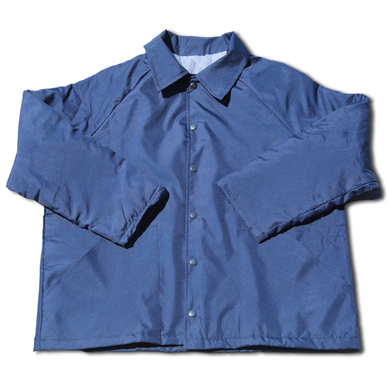 The Men's Polyester Medium Weight Jacket in Navy Blue. The jacket has a 100% polyester shell and quilted 4 oz grey liner, a combination of 100% nylon teffeta and 100% polyester batting.