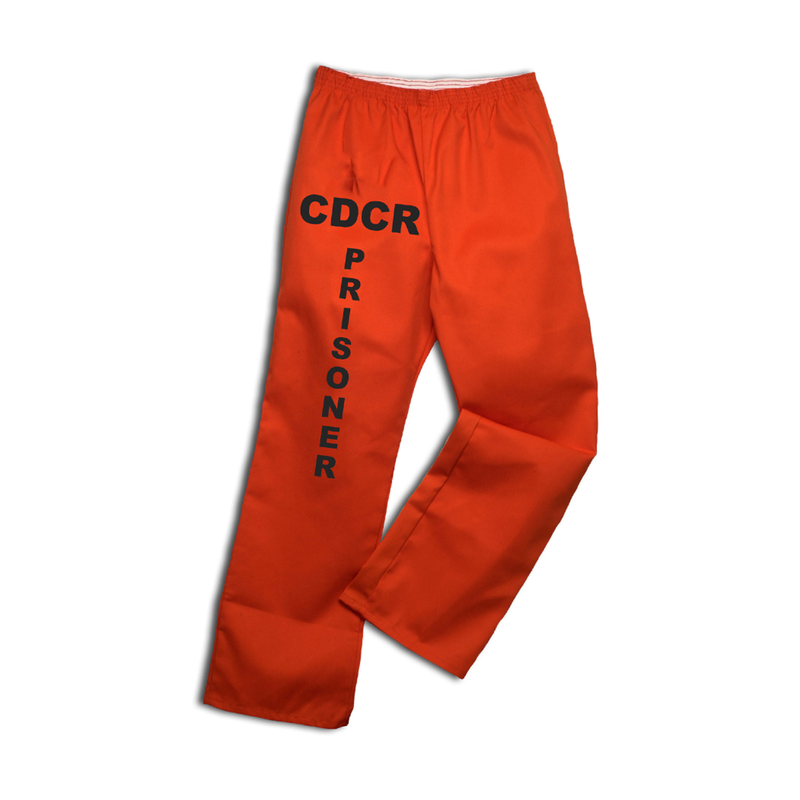 The Slip-On Trousers have a full elastic waistband. Self closing fly with fly extension. Silk screened "CDCR Prisoner" down right leg in black ink.