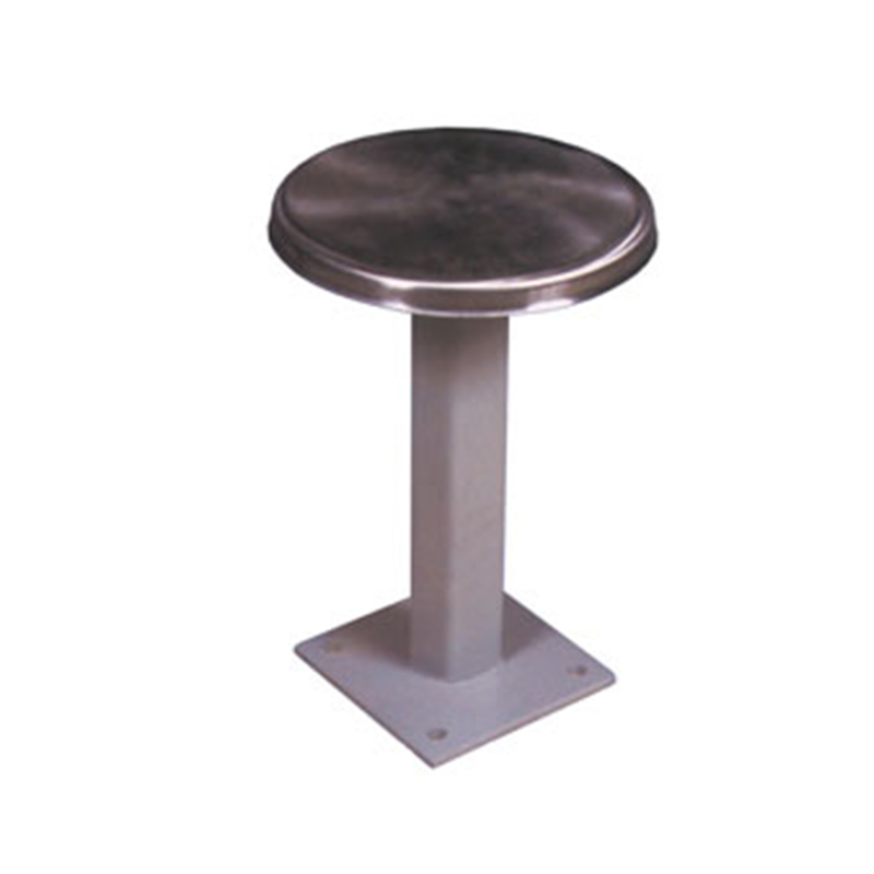 The 17''H Stainless steel floor-mounted stool has a 12'' diameter seat carried on heavy-duty 2"x4" steel tubing used in bed and desk construction. Requires a single mount, with tubing welded closed at the mount and in front. Includes attached mounting plate, pre-punched with four holes for floor mounting. Hardware not included.