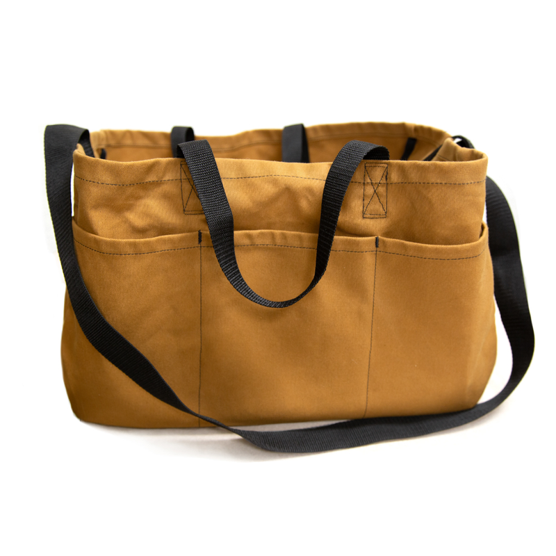 The Surveyor Stake bags in rust are sturdy with five pockets. The bag has a shoulder strap and carry handles.